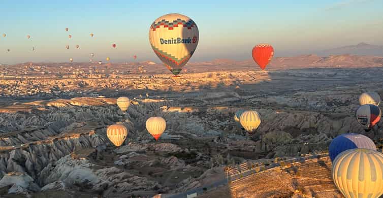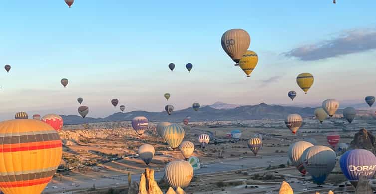 Erlebe einen fantastischen Panoramablick auf Kappadokien aus der Vogelperspektive und erkunde die Region bei einem Heißluftballonflug am frühen Morgen.