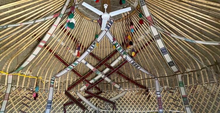 - Юртовий табір: поки готується вечеря, мандрівники можуть покататися на верблюдах, поспостерігати за заходом сонця, а після обіду відпочити компанією біля вогнища під народні пісні місцевих кочівників, ніж досліджувати Чумацький шлях серед чистого неба.